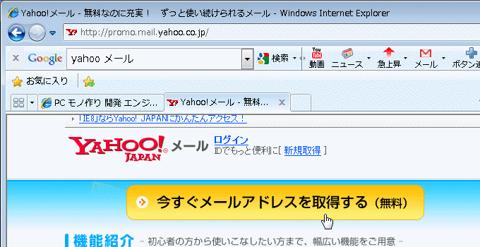 以下は最大手 Yahoo のフリーメールアドレスの取得の方法です。
