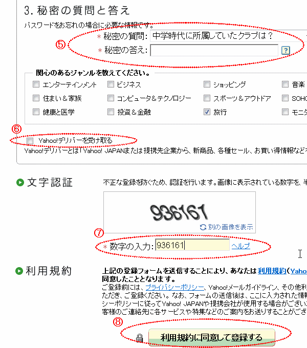 ⑥ 初期には「Yahoo!デリバリーを受け取る」にチェックが入っていますが、このチェックが入ったままだと、Yahooから広告メールが届きます。これを外せば余分な広告メールが来なくなりますからここは外した方が賢明です。
