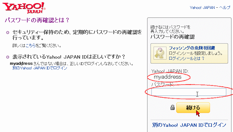 登録情報の変更にはパスワードの再確認を求められるので、Yahoo! Japan ID に間違いないことを確認して、先ほど入力したパスワードをもう一度そのまま入力し、下の「続ける」ボタンを押します。