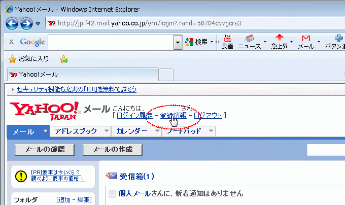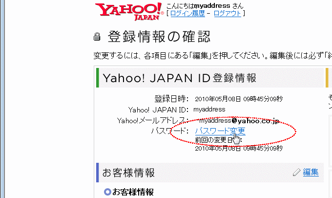 先ほど入力したパスワードなどの情報を変更するには、Yahoo に一旦ログインしてから、トップ画面の「登録情報」というリンクをクリックします。