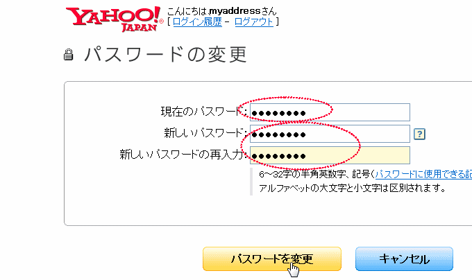古いパスワードと 新しく使いたいパスワードを2回入力します。最後に「パスワードを変更」ボタンを押します。