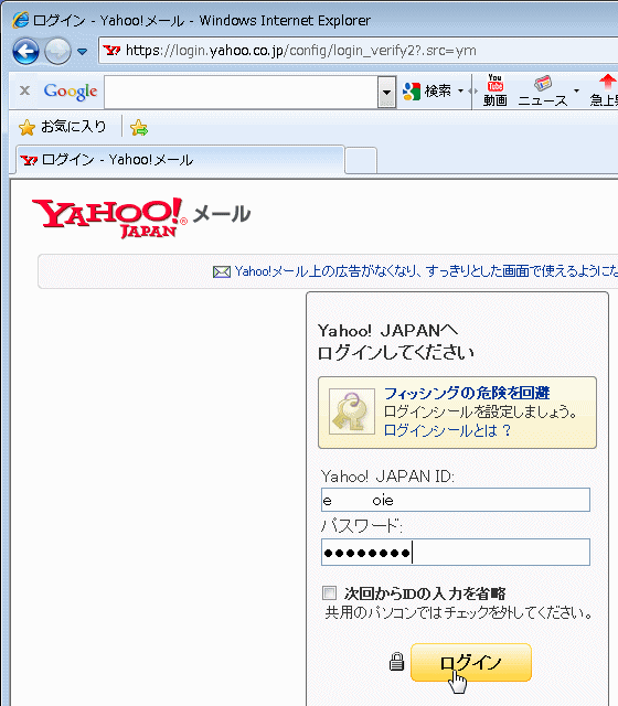 Yahoo! JAPAN ID と パスワードの入力画面になる。Yahoo! JAPAN ID(取得したメールアドレスの @の前の部分)とパスワードを入力して「ログイン」ボタンを押します。