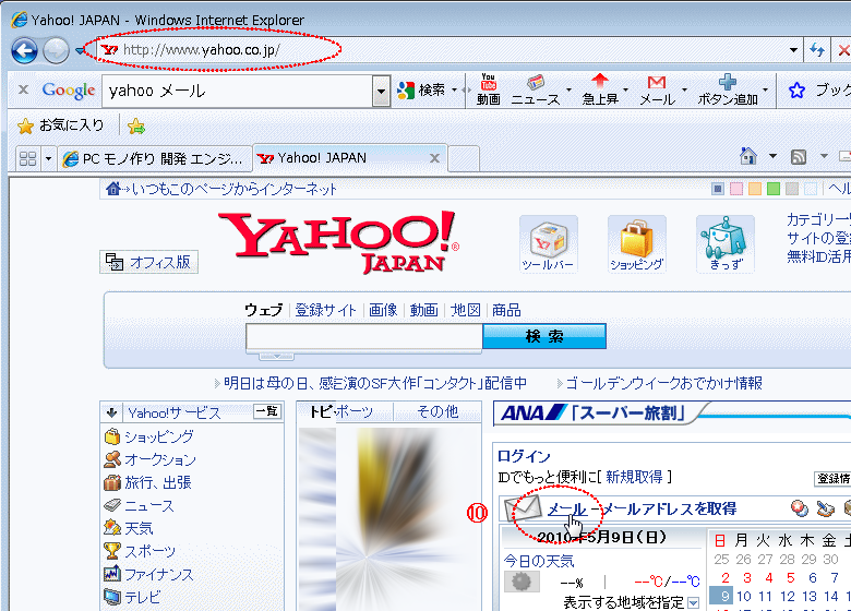 ⑩ インターネットエクスプローラの URL欄に 「http://yahoo.co.jp 」と入力して Enterキーを押し、表示されたYahooのトップページの右下の方の 「メール」という部分をクリックします。