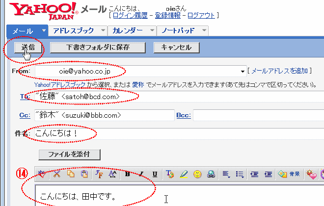 「To:」 にメールを送る相手のメールアドレス 「Cc:」には同時にこのメールを読ませたい人のアドレスを入力します(Cc.はカーボンコピーの略、Bcc.はブラインドカーボンコピーの略で他の人からはアドレスが見えなくなる)。入力はキーボードからタイプ入力するか、別のメールなどからアドレスをコピーペーストするか、アドレスブックから選択します。毎回同じアドレスをタイプして入力するのは面倒なので、何回もメールを出す可能性のある相手のメールアドレスはアドレスブックに登録しておくと入力の手間が省けます。