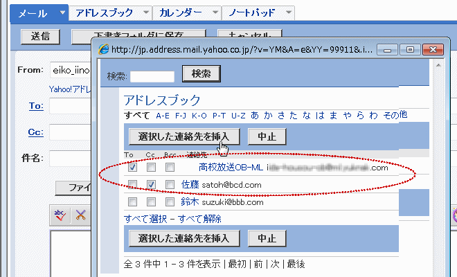 アドレスブックのアドレスリストが表示されたら、To: に入れる相手と Cc.に入れる相手のチェックボックスにチェックを入れて「選択した連絡先を挿入」をクリックします。