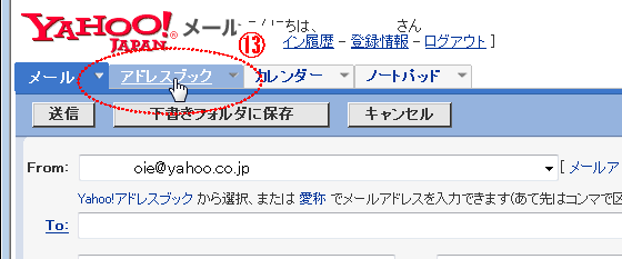 アドレスブックにメールアドレスを登録するには、アドレスタブ( ⑬ )をクリックしてアドレスブックを開きます。