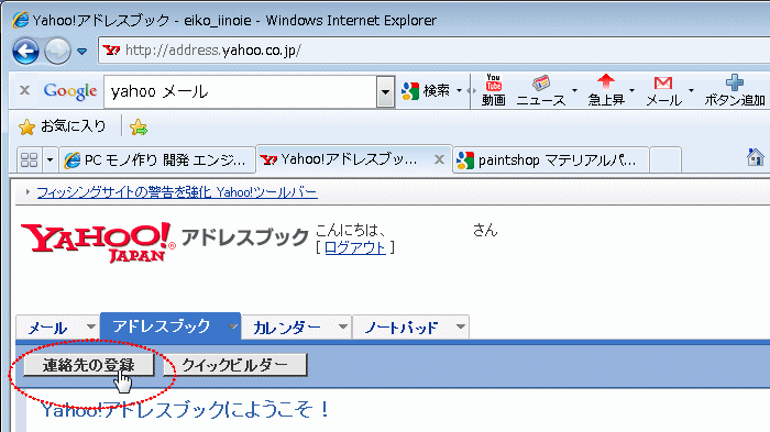 アドレスブックタブが開くので「連絡先の登録」をクリックします。