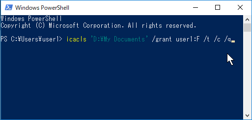 という結果が表示されるが、ファイル数が多いと多少の時間がかかる。icacls 'D:\My Documents' /grant user1:F /t /c /q