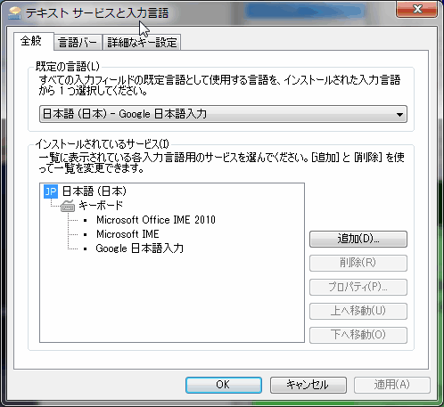 特にインストールには難しい点はないと思う。ダウンロードファイルを実行すれば普通にインストールが出来る。インストールされると 「コントロールパネル」>「地域と言語」>「キーボードと言語」タブを開いて「キーボードの変更」ボタンを押すと下のようなダイアログが表示され、「Google 日本語入力」が表示されてインストールされたことが分かる。