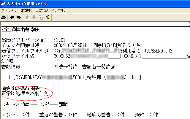 HTMLフォーマットで出願書類と図面などが準備できたら、インターネット出願ソフトに「文書入力」します。 インターネット出願ソフトのルートフォルダ(標準は C:\JPODATA )の下に、「出願用」などの適当なフォルダーを作成します。そしてそこに作成した出願用ファイルを全てコピーします。(出願書類は一応HTMLフォーマットで、図面など別ファイルはリンクがかかっていますので、予め同一フォルダーで作成しておかないと、エラーになる可能性があります。) ![]() まず、「出願」タブで「送信ファイル」を選択します。すると上の「文書入力」というボタンがアクティブになってクリックできます。 ここをクリックすると出願ファイルの参照ウィンドウが開きますので、先ほどコピーしたフォルダーの出願ファイルを選択して「指定完了」ボタンを押します。 ![]() インストールされている電子証明書(電子的なハンコのようなもので本人であることを証明する)で署名(暗号化)をするための確認画面が表示されます。実行ボタンを押すと書類の形式チェックも同時に行われます(数十秒)。 ![]() 署名・チェックが終わると以下のようなウィンドウにチェック結果が表示されます。 ![]() もし上図の赤丸内のようにエラーや警告があったら「入力チェック結果表示」ボタンを押すとエラーや警告内容が表示されます。下の図はチェックの結果で図面をモノクロで作成しなかったため警告が出たことを示しています。 ![]() エラーは修正しないとファイルが送信トレーに入らず送信できません。警告はそのままでも送信できますが、文字数が推奨の字数に入らないなどの警告なら無視しても構いませんが上記のような図面にかかわる警告などは自動で減色されると意図が伝わらない可能性があるので、なるべく自分で訂正した方が良さそうです。(グレーの濃さで領域の違いを表現していたりする場合、ハッチングの向きや密度で領域を塗りなおした方が明快です) エラーや警告が出なくなるまで上記文書入力作業を繰り返します。私が遭遇した若干のエラー対処の仕方はこちら。特にエラーや警告がなければ以下のような表示になります。 ![]() 念のために「入力結果表示」を押すと今度は「正常に処理されました」となりました。 ![]() これでやっと該当の「特許願い」を選択すると「オンライン出願」ボタンがアクティブになって押せます。 ![]() 「オンライン出願」ボタンを押すと送信確認ウィンドウが表示されます。 ![]() 「OK」ボタンを押せば 特許庁にSSL(暗号化)接続して送信が始ります。文書や図面のサイズによりますが、ADSL以上だったら 2-3分で送信が完了します。 ![]() 無事送信が終われば、以下のような表示が出ます。 ![]() 受理済みフォルダーの中は「接受」という結果が表示されます。 ![]() 「受領書」フォルダーの中を確かめると、確かに今回の出願の日時で受領書があります。 ![]() 7.チェックでエラーが出る場合の対処