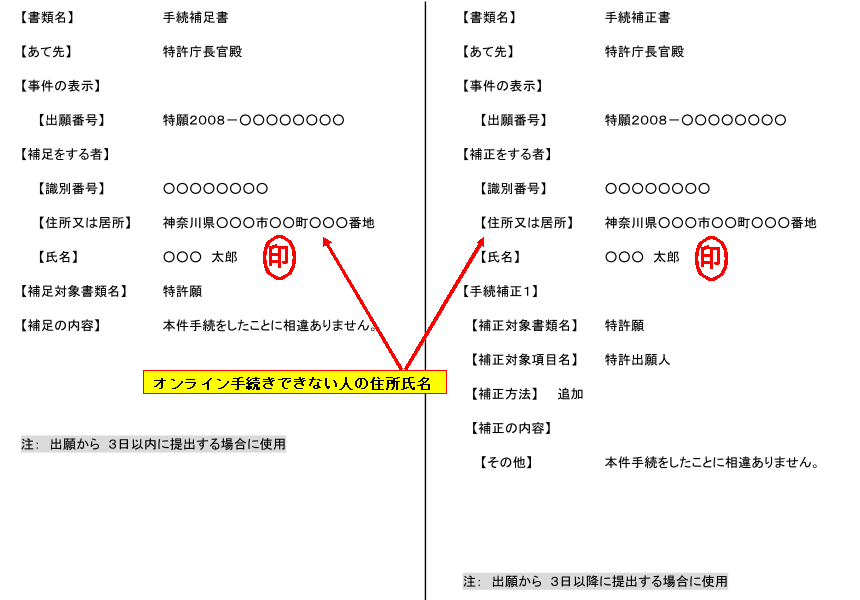 出願人が一人の場合は、今までの作業で終了しますが何人かで共同出願する場合はまだ作業があります。紙の出願の場合、出願人全員が出願書類の 1ページ目に記名・捺印すればよかったのですが電子出願の場合は、「ハンコ」が無いのでそうはいきません。 オンラインで出願する出願人はこの図.1のように、印鑑証明と住民票を使って電子証明書を入手し、その電子証明書を使って特許庁に接続することで本人であることの確認がとれており、以降出願ソフトに Pinコードで本人認証してログインして作業することで本人認証とみなされます。 共同出願人が全員同じような手続きをしておりオンラインで特許庁に接続出来る場合は出願後に出願番号を基にオンラインで手続きが可能ですが、一人でもオンラインの申請人利用登録をしていない場合は、その人(オンラインで手続きできない人全員)はハンコを押した紙の補足書か補正書(下図参照)を郵送で提出して出願の意思確認をする必要があります。 この書類を郵送すると、後日「電子化手数料」の請求書が送られてきて現金振り込みをする必要があるようです。 ![]() 出願から 3日以内に特許庁に届く(あるいは書留などで送付日付が分かる場合は投函する)場合は、左側の補足書を、それ以降になる場合は 右側の補正書を、特許庁長官に送付します。 住所の上の識別番号とは、特許庁が出願人に付与する番号でその出願人の最初の出願となる時はありませんから空欄です。一回出願すると特許庁から識別番号の付与通知が届きますので、2回目からはその番号を記載します。 宛先は、紙の出願と同じで 〒100-8915 東京都千代田区霞が関三丁目4番3号 特許庁長官 殿 です。(2010年 10月現在) これを忘れると、1ヶ月後くらいに特許庁から「手続補正指令書」という文書が届き、30日以内に手続補正書を提出しないと出願は却下され無効となります。 オンライン手続きの一環としては、なんともクラシックな手続きで、しかも 100円ショップで買ってきたハンコでも通ってしまう**こんな書類に何がしかの意味があるのか?と首をかしげたくなりますが、特許法上は出願者全員の意思確認が必要と言うことで残されてた典型的なお役所の書式のようです。 (** 勿論、他人が印鑑を押して出せば「有印私文書偽造?」の犯罪になると思いますが) |