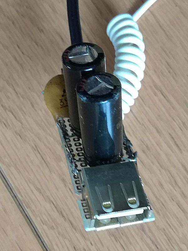 ③ 上記の電源問題を確認するために ACアダプタの出力に電解コンデンサ(合計2000μF)を付けて特製の電源を作って見た。この電源を使うと同じ ACアダプタでもかなり接続できる確率はアップする。しかしまだ PCの USB端子には及ばない。