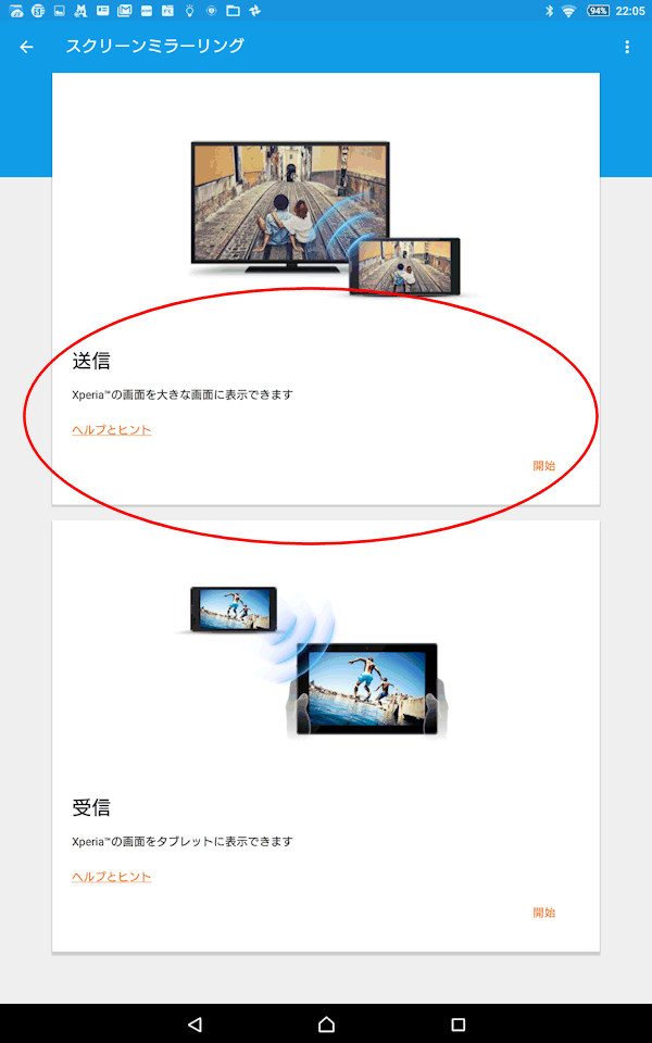 スマホが Miracast(スクリーンキャスト)対応なら、スマホ側は別途のアプリをインストール・実行する必要がなく、「設定」で「スクリーンキャスト」を「ON」にすることで画面送信が可能となる。(実行するアプリの制限なくすべてのアプリの画面が送信可能)
