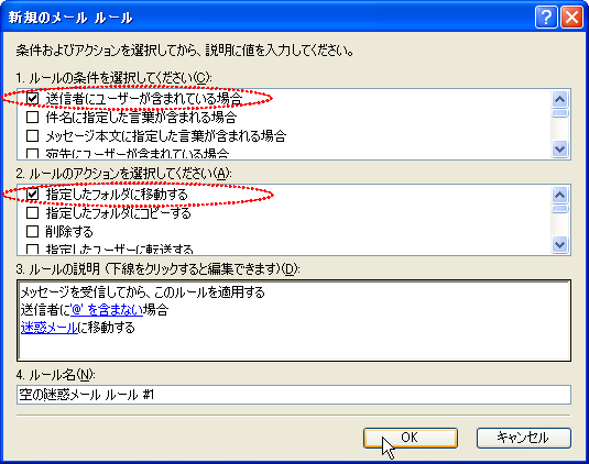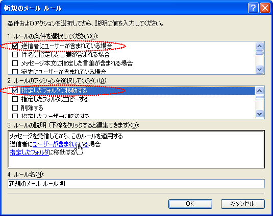 1.の中から「送信者にユーザが含まれる」と 2.の中から「指定したフォルダに移動する」にチェックを入れる。
