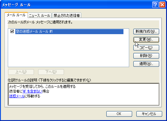 暫くは、以上の状態で様子を見る。送信者が空のメールの移動先のフォルダーを時々確認して、「受信トレイ」ではなくて「迷惑メール」(移動先に作成したフォルダ名)フォルダに問題のメールが届くようになればOK