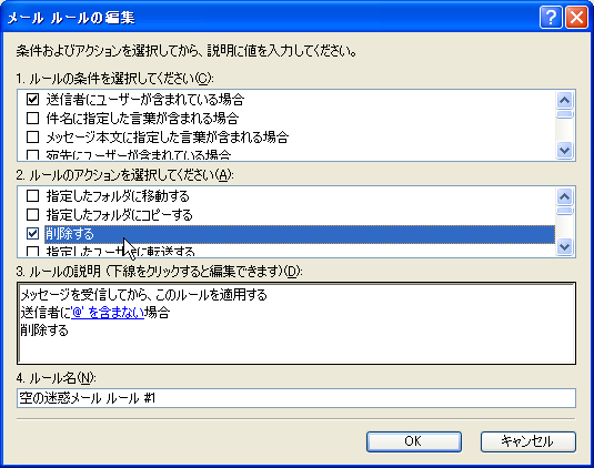 以上で、送信者名が空の迷惑メールが自動で削除されるようになるはずです。
