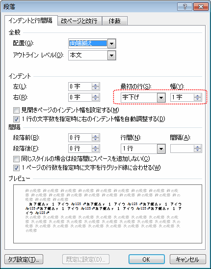 下のような段落の書式設定ダイアログが開くので目的の書式項目を変更する。例えばその段落は最初の行を必ず1字 字下げをしたければ下の図のように「最初の行」の項目を「字下げ」にしてその右の欄で字下げの数値を設定する。