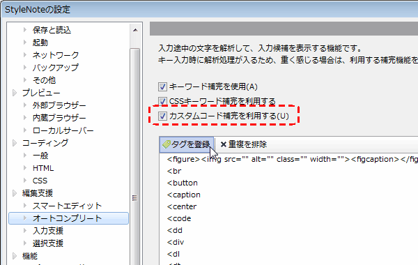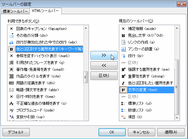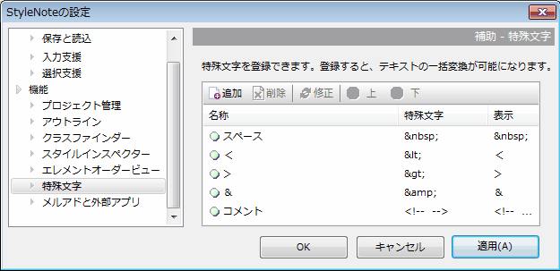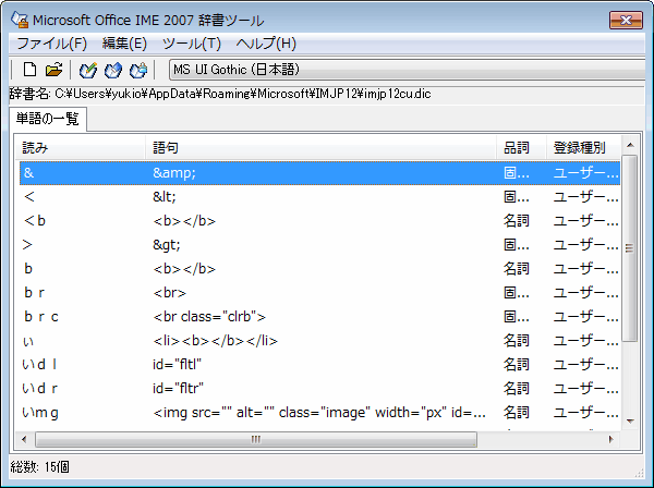 それは IME辞書の活用。IME辞書の単語登録機能で 例えば 「<br>」 という文字列を単語として「br」という読みで登録しておくと、改行を入れたいところで漢字変換モードのままキーボードから「br」と2文字入力してスペースを押すだけで改行タグが挿入される。「<br class="clrb">」のような属性値まで含めた文字列も「brc」とか「<img src="" alt="" class="image" width="px" id="fltr">」なども「いmg」(キーボードは「img」)として登録してある。これを上手に使うと文字入力中はキーボードから手を離さずに打てるし、日本語を入力している最中に漢字変換を解除する必要もなくてボタンよりもはるかに早い。文責: このページの内容の責任は Y.Nakajima にあります。 StyleNote 5.08 を使用して確認しながら作成しておりますが、全てが正しいことを保証するものではありません。記述についての問題点のご指摘は Y.Nakajima 宛てにお願いいたします。 |