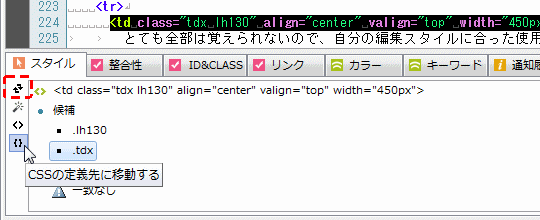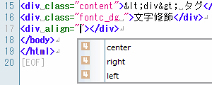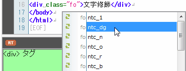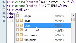 ![]() 例えば <div> </div> タグをセットで入力する場合は、「 <div 」と入力して終端の > の代わりに半角スペースを入力した途端、 <div></div> と終端タグまで変換確定される。おまけに図.2-1のように、同時に属性の入力候補のリストボックスが表示されるので、クラスやスタイルなどの入力を追加する場合は楽だ。 更に、例えば上記操作で属性として class を選択して入力すると「 class="" 」と言う文字列が入力される。そうしたらそのダブルクォーテーション ”” の間に キーボードから1~2文字入力するとその文字列が該当するセレクタが 図.2-2のようにリストで表示され、希望のセレクタをクリックするか ↑ ↓キーで選択入力が可能になる。 ![]() クラス属性のセレクタ併記は結構使うので、いずれ併記に対応するように改善されることを望む。) ![]() |