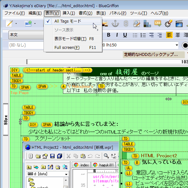 だんだん欲が出てくるが、BlueGriffon の All Tagモードのよううな、タグが表示されるプレビュー画面モードが選べると、もう本当に他のエディタは要らないだろうと思う。![]() (右図は BlueGriffon の All Tag モード: TABLEの中に TABLEが入れ子されている状況が一目でわかる。) |