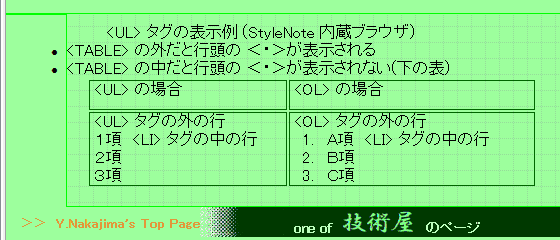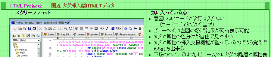 StyleNoteの内蔵ブラウザエンジンは PCにインストールされている IEらしいが、細部で IE(私の環境では Ver.10)とも、Chromeなどとも違っている。気づいたのは <UL> タグの中の <LI> タグの行頭の<・>が TABLE内では表示されなくなってしまうこと。margine-left: 1em 等とすれば表内に入るので表示される。 ![]() StyleNoteの内蔵ブラウザ ・TABLE中の<LI> タグの行頭の<・>が表示されない。 ・(主原因は <!Doctype> のHTMLバージョン宣言部と スタイルシートのミスマッチの場合だが)<div> で上部に固定表示されるように設定した要素(右図の濃緑色部分)が画面下部に表示されてしまう。 下の IE等との違いを参照 InternetExplorer 10PC にインストールされている Internet Explorer の表示: TABLE中の<LI> タグの行頭の<・>は表の外に表示されている ChromeTABLE中の<LI> タグの行頭の<・>は表の外に表示されている FireFoxTABLE中の<LI> タグの行頭の<・>は表の外に表示されている おそらく、内蔵ブラウザでは表の外にはみ出した部分は表示しないようにしているんだろう。 もうひとつ、表のセル幅や 縦位置の表示が一致しない。(★★★) 同一ソースで Chrome (IEも同じ) と比べたのが下図だが、2列の表の右列に更に表を入れ子して、親の表の列に幅を固定値で設定し、子の表は 幅を 100%で指定しているが、何故か親の列幅指定が効かない。どんな値が解釈されているのか全く不明。更に左列に挿入した画像が topではなくて bottom に表示されてしまっている。原因は スタイルシートで table 等に vertical-align: baseline; を設定しているためらしく、HTML側で td要素に valign: top; と指定しても無視されているようだ。 StyleNote 内蔵ブラウザ Chromefigure タグの表示レイアウト(★★★) ![]() 最近気づいたところでは、<figure class="" id="floatright"> <img src="" alt=""> <figcaption class="centertext">画像タイトル</figcaption></figure>( ・・・説明テキスト)のような記述をしても、IE他ではきちんと 画像は右側に、キャプションは画像の下に、説明テキストはその左側に回り込んで表示されるが、StyleNoteの内蔵ブラウザは 左端から順に画像・キャプション・説明テキストの順になってしまい、文字が画像の横に回り込まない。 ![]() <img> タグの中では 同じ id="floatright" の指定を行えば、画像の左側に文字列が回り込む。現時点で気づいているのは <figure> タグの中でフロートを使用した時だけ。 その他、(主原因は <!Docutype> のHTMLバージョン宣言部と スタイルシートのミスマッチの場合なので取り上げるのもはばかられるが、<DIV>で指定した Headerセクションの表示位置が、IE/Chrome/FireFox などはミスマッチにかかわらずページ上部に表示されるのに、内蔵ブラウザでは要素の下部に表示されている(このセルの一番上の図の<one of 技術屋>という部分) strictな解釈と言う意味では StyleNoteが正しいのか?? このように 何点か外部ブラウザと 属性などの解釈の違いがあるようで、レイアウトが正しく表示されないケースが散見される。したがって現時点ではかなり高頻度で外部ブラウザによるチェックが欠かせない。(要は私自身が HTMLタグの細部に自信がないと言うことの裏返しだけど) HTML Project2の時は、IEに限定すれば互換表示されていたので、これほど神経質になることは無かった。 プレビュー画面がリアルタイムに表示されると言う特徴があるだけに、その長所が生きないということで この点は非常に惜しい。 |