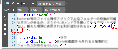 (些細な問題だが)右図は、画面の右端でソースコードを折り返した時に、<tr>タグが途中で折り返された場合の表示例折り返されたコードの方はタグ表示がリセットされてしまっている。 |