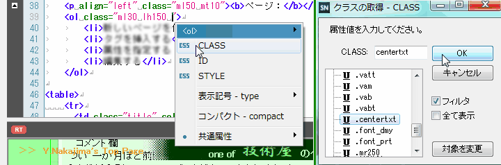 StyleNoteは タグの属性などの挿入方法が簡単になるように工夫されている。しかし、挙動が若干びっくりさせられることもある。例えば図のような感じで、タグの属性値に classや idを追加挿入しようとして、" "の間で右クリックして 「CLASS」を選択すると図の右のように「クラスの取得」というポップアップが表示されるが、ここで何か新しいセレクタを選んで「OK」を押すと、元々挿入されていたセレクタが全部消えて新しく選択したセレクタだけに置き換わってしまう。(図の場合、"ml30 lh150 centertext" となることを期待しているのに、"centertext" だけになってしまう) 「キャンセル」ボタンを押すと、キャンセルではなくて属性欄はクリアーされて空になってしまう。私のようにセレクタをあまり増やし過ぎると覚えられないので幾つかのセレクタを組み合わせて使用する使い方ではちょっと困った問題だ。ここはやはり通常の挿入/上書き動作と同様、範囲選択して新しいセレクタを選んだら上書きされ、範囲選択なしで新しいセレクタを選んだら、その位置に追加挿入される仕様にならないもんだろうか? それと、このコンテキストメニューから CLASSの セレクタを選ぶと 下図の例では「 .centertext」とセレクタ名の前に「.」が付いたままになってしまう?? 同じく ID を選ぶと「#」が付いたまま挿入されてしまいこのコンテキストメニューは使えない。 |