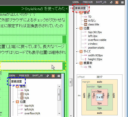 高機能な分、新しい機能が多すぎてマニュアル作成が追い付いていないんだろう。何をどう使えば何が出来るのか、ユーザが想像しないとならない状況。(若しくは、マニュアルがあるのかもしれないが HPの構成上調べられないのかも)折角多大な工数をかけて開発しているのにもったいない。現状ではある程度のスキルがあるユーザが辛抱強く使い方を模索しながらでないと使いこなせないと思うが、これではユーザはあまり広がらないと思われる。 とグチを言っても仕方ないので、簡単なマニュアルを勝手に作ってしまいました。 操作に悩んだらここを参照してみてください。 例:現時点では「オブジェクトインスペクター」というツールは、私の環境では内蔵ブラウザ上でもソース画面上でも属性指定のあるオブジェクトをクリックしても全く変化しない。使い方だとは思うが、正しい使い方が分からないので確かめようがない。 ・・・・と、このページを更新しながらも1週間ほど悩んだ末、今日分かったことは 右図のオブジェクトインスペクター上の「要素調査」という部分がボタンになっていてそこを押さないと表示されないと言うこと(図の青い破線は押す前、これが右上の赤い破線部のように押された状態になり、マウスカーソルが載って表示している要素は黄色い破線で囲んだように白抜き等に反転する)。しかし最初の頃操作した時は何度か押したにもかかわらずボタン表示にも変化がなかったので違うと思い込んでいた。マニュアルがあれば再起動するなりして何度も試したと思う。 で、使えるようになったので二つ上の問題、<表の列幅が 外部ブラウザと異なる>点に関して使ってみると、表の列幅の最終値は表示されるが、それは計算結果の最終数値だけだった。どのようにしてその値が決まったかは分からない。私の期待では上位要素の設定値も含め表示してくれないとあまり意味は無い。例えば親の表幅が 700pxで 列はその 30%、スペース5pxのその列に表示された表幅が 100%だから 700x0.3-(5x2)= 200px というような「インスペクター」で結果を出している過程が分からないとコーディングにはあまり生かせないような気がする。 更に、マニュアルがないので右上図のレイアウトの各数値のうち、真ん中の <5 x 9>という数値の意味が? |