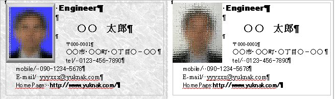 また、好みですが、地に大理石のような薄い繰り返しパターンなどを入れてもセンスが良くなるかもしれません。下の画像は何もしない名刺画像とこうした手を加えた名刺画像です。(Open Office Writerの画面を取り込んでいますので改行マークが表示されていますが、当然印刷では見えません。)