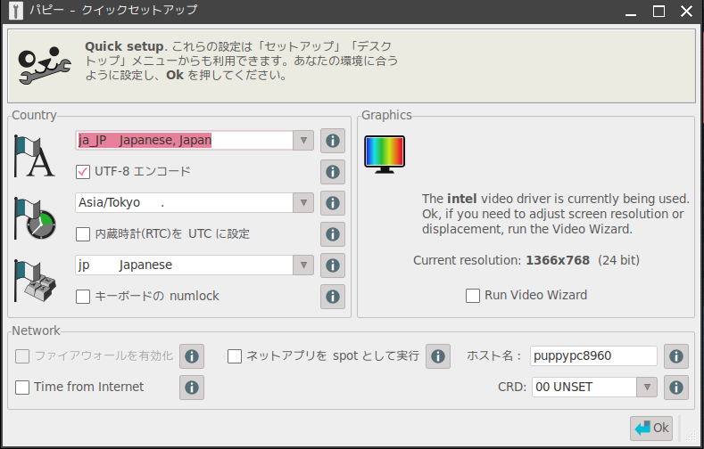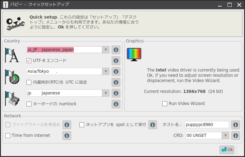 起動用 USBから起動した時と同様に、国や地域の設定ウィンドウが表示されるが、通常日本語対応の Puppyの場合はそのまま OKで構わない。