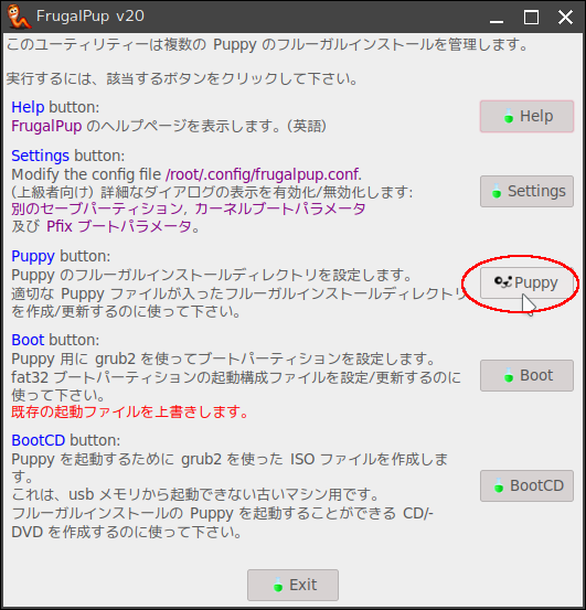 以上でPuppyの実行ファイルは全てターゲットUSBの第2パーティションに書き込まれたが、