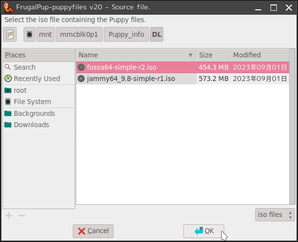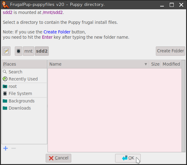 Puppy をインストールしたディレクトリを選択する。Frugal インストールしたとき、ディレクトリを作成せずにパーティション直下にインストールした場合は、図のようにパーティションが選択されているだけ(赤下線部分)で、ディレクトリは選択されていないのでそのまま OKボタンをクリックすればいい。