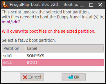 この作業を Puppyのインストールに続けて行わない場合(再インストールの場合など)は、右図のように (このUSBメモリで起動する)Puppy が含まれるパーティションを選択するように促されるので、ターゲットUSBの Puppyをインストールしたパーティションを選択して OKボタンをクリックする。