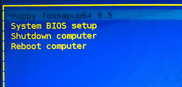 起動時には Grub2 の O/S選択画面が表示される。上記でインストールした USBメモリから起動した場合は、Puppy(Fossapup64 9.5)が優先的に選択されているのでそのまま待つか、Enterキーを押せば Puppyのブートが続行する。