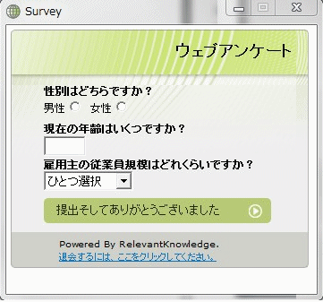 かなり古い ウイルス/スパイウェアで、最近のものは ブラウザで入力した IDや Passwordなどをリダイレクト(違うURLに送信する)して盗む他、PCの閲覧履歴などの情報を勝手に送信するなどかなり危険なスパイウェアらしい。各種マルチメディア関係のフリーウェアに仕組まれているようで、インストールされると PC起動時にデスクトップ画面右下に右図のようなポップアップウインドウが表示される。間違っても「提出そして・・・・」とか「退会するには・・」というボタンやリンクは押さないほうがいい。