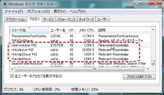起動したら、「プロセス」タブを開いて画面を下の方にスクロールしていき、イメージ名欄の 「rlservice.exe」か説明欄の「Relevant-Knowledge」という行を探す。「Relevant-Knowledge」はおそらく、上図のように 3~4個見つかる。基本的には、この説明欄の「Relevant-Knowledge」となっているプロセスを選択して、右下の「プロセスの終了」ボタンを押す。多分 上 2つを終了させれば残りは同時に終了すると思われる。