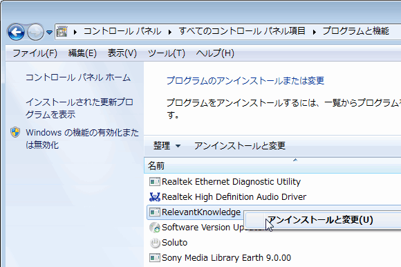 「RelevantKnowledge」というプログラムを探して、右クリック「アンインストールと変更」を押してアンインストールする。