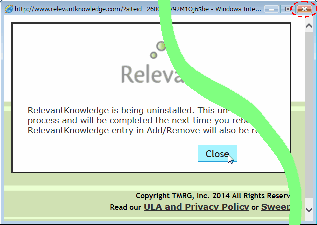 アンインストールが終わると下図のようがウインドウが表示されるかもしれないが、ここでは「Close」ボタンは押さずに、右上の終了ボタンを押してウインドウを閉じた方がいい。スパイウェアの製作者が設計したプログラムなので、ウインドウ内のボタンの動作は敵の思うように出来る。せっかくアンインストールしたと思ったら、表面上は見えなくなって、実は地下に潜っただけというような事だって出来てしまう。