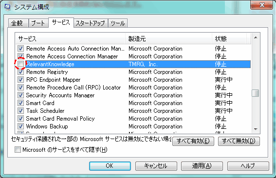 サービスタグを開いて、下の方にスクロールしていき、「RelevantKnowledge」というサービスを探し、左のチェックマークを外す。