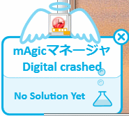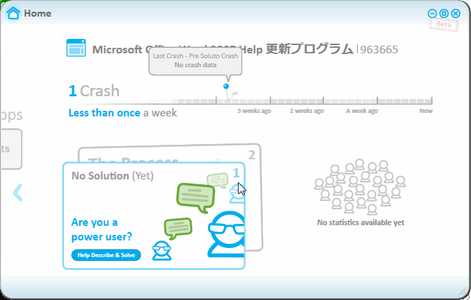 サービスがクラッシュした時に出現する「天使」(左図の天使の羽のマークがデスクトップの右端から出現してフワフワ上昇していく。まさに「お亡くなりになりました」というギャグらしい) と解決策の提示(下図:この場合なし・・・ほとんどの場合ないと思われるが、Power Userをクリックして解決策を記入し送信すると他のユーザの Solution として使われるようだ)