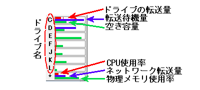 尚、右図の 緑のバーは 空き容量(%)、一番下の 「+」は 赤:CPU使用率、青:ネットワークの転送量、緑:物理メモリの使用率%で、ネットワークの応答が遅い場合などの参考にもなりそう。