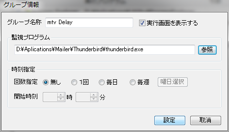 グループ名称を適当に付ける。「監視プログラム」は ここに登録したプログラムが起動するまでこのグループの起動は待機する。Windows起動後無条件で実行したい場合は空欄。手動で実行するプログラムを登録すると、そのプログラムを実行しない限り 順太郎クンとそこに登録したプログラムが起動しなくなるので注意。