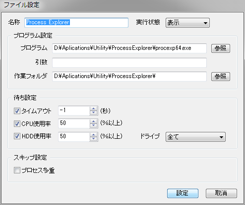 このアプリは、登録したアプリの起動の順番だけでなく、「○分後に実行」とか「HDDや CPUの使用率が○%以下になったら実行」などの詳細な制御条件が設定できるので、今回の目的にはピッタリ。
