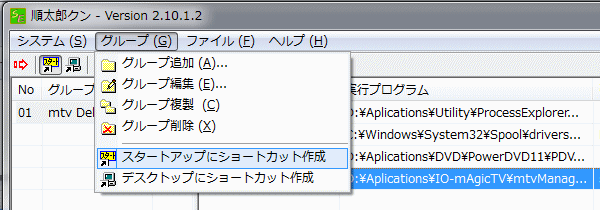 目的のプログラムを上記手順で全て 「ファイル追加」で追加したら今度はそのグループをスタートアップに登録する。「グループ」メニューの「スタートアップにショートカット作成」を選ぶ。