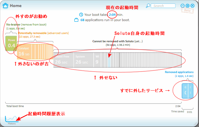 しかし、翌日の立ち上げではやっぱりそれほど改善しない。Avastは起動時の処理に 20~30秒かかっているのでその分だけは速くなったんだろうけど、4~5分かかっている全体の中では、2度目の起動(2分程度)に較べて体感できるほどではない。毎回 ストップウォッチと睨めっこで起動時間を計るのも面倒だし・・・と、起動時間・計測などのワードで検索すると Solutoという毎回の起動時間を自動で記録して、遅くなったと気づいた場合に後からでも、いつから遅くなったのか確かめることができ、その前にどんな変更を加えたのかが自動で記録されるというツールが見つかった。しかもO/S起動時に自動起動されるサービス毎の処理時間と、そのうちの不要と思われるサービスをリストしてアドバイスをしてくれる‥等々という「超」のつくくらい便利なツールだ。