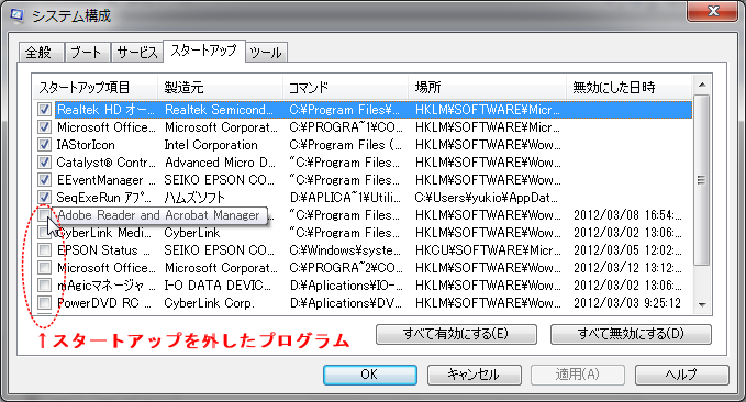ここには Windowsが起動するときに実行され、メモリに常駐して実行されるプログラムのリストが並んでいる。ここで必要ないものは左側のチェックをはずすと、起動時に自動的に実行されることはなくなる。アプリやプリンタなどのハードをインストールすると、起動時に勝手にアップデートをチェックしてアップデータが存在する場合に知らせるようなお節介なアプリがインストールされることが多いが、それらはチェックを外した方がいい。