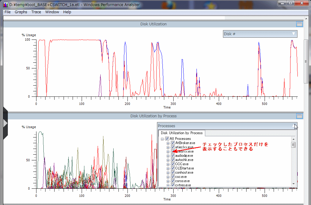 プロセス毎のアクセスは「Process」という部分をクリックするとプルダウンでプロセスの一覧が表示されるので、必要なプロセスにだけチェックマークするとそのプロセスのアクセスグラフだけが表示されて見やすくなる。