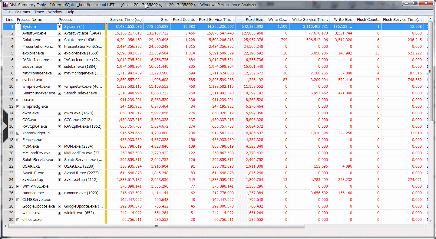 Quick は再起動時、Slow は朝一番の起動時のトレース結果のトータルで、起動後 2分までに読み込まれるサイズ合計の比が、再起動では朝一番の 1.5倍程度になっており 朝一番の起動時の HDDアクセスが遅いことが裏付けられた。