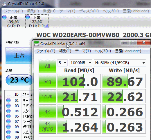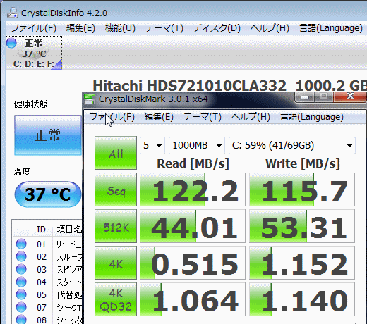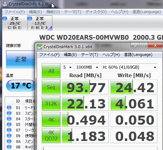 Crystal DiskMark というベンチマークツールを使って、起動直後に HDDのアクセススピードを計ってみると Read も遅いが Writeが更に遅い。しかし測定中に温度は HDDの自己発熱で徐々に上がるので、O/Sの起動が遅い上に1ラウンド 5分以上の測定を繰り返すと 2度目の途中くらいからスコアが上がり始める。同じ作者の Crystal DiskInfoという HDDの情報表示ツールでS.M.A.R.T情報を表示させて温度を見ながらベンチをとると、18℃あたりから性能が変化して正常値になるようだ。