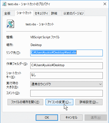 作成したショートカットのアイコンのプロパティを開き「アイコンの変更」ボタンを押す。(vbsファイルを直接デスクトップに置くと「アイコンの変更」ボタンは表示されない=変更できないので注意)